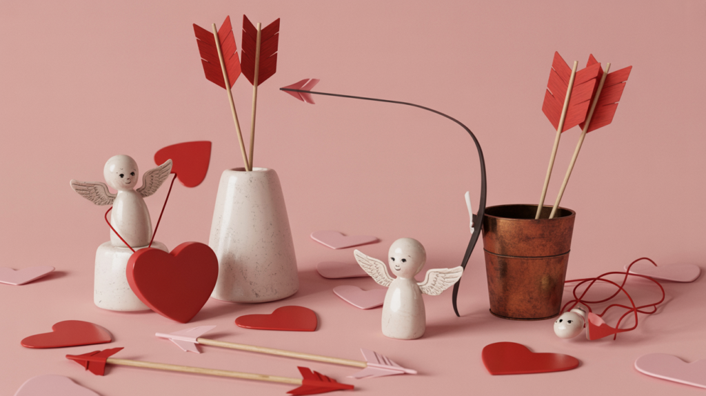 There’s just something classic about a tiny cupid or two hanging out in your Valentine’s vignettes. Add winged figurines, a mini quiver, or old-fashioned arrow motifs to bring that playful, retro energy.