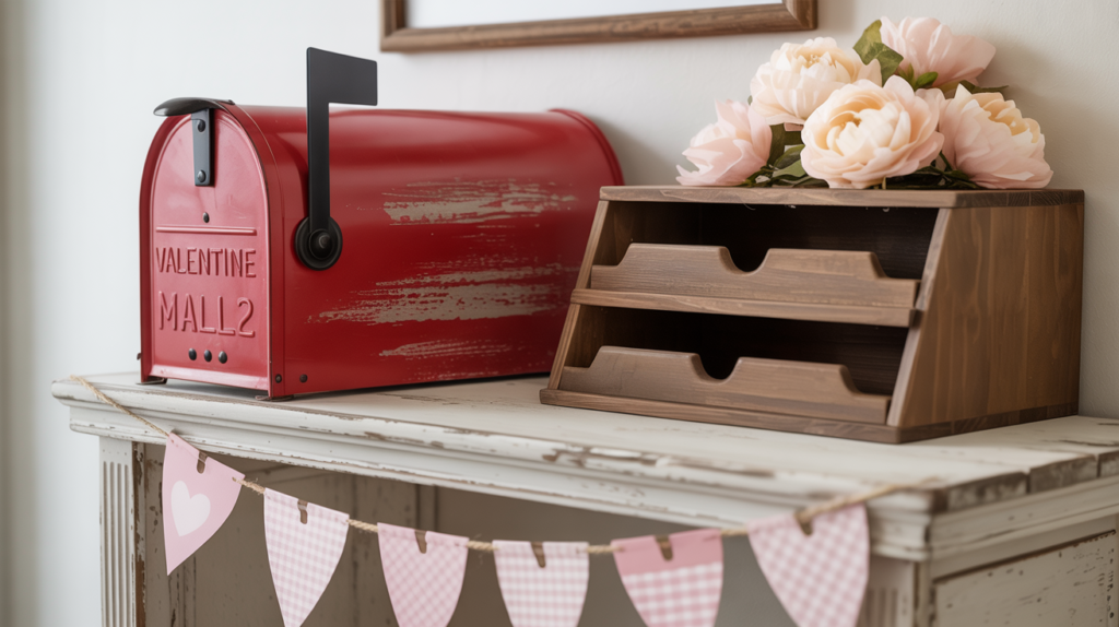 A weathered red mailbox and a wooden mail sorter create that old-country-letter vibe, especially when you add blushy faux florals or a little greenery.