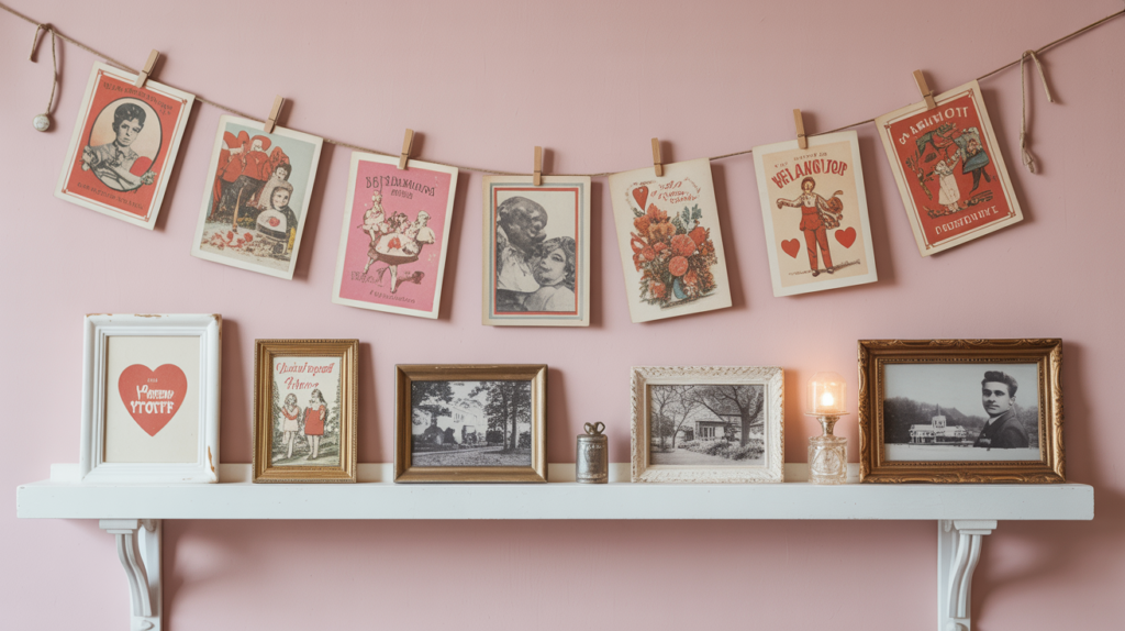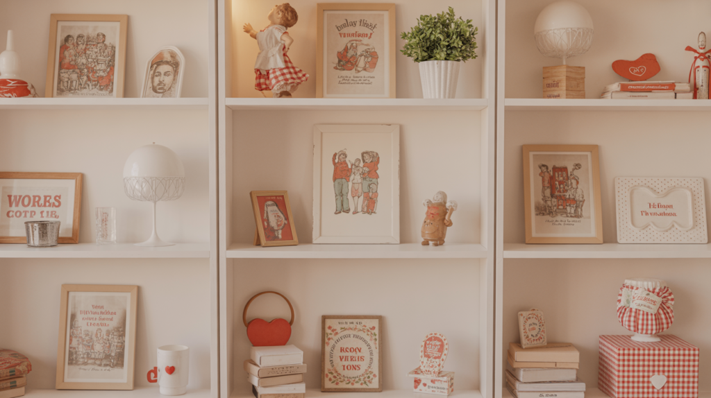 Displaying vintage valentines decorations on open shelves is practical too. You can see every cute element at a glance. This approach keeps things relaxed and homey, not too precious or staged.