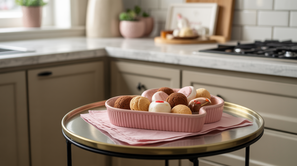 Heart-shaped dishes are a charming way to sprinkle Valentine’s spirit throughout your home. Use them to hold chocolates, gummies, or conversation hearts and place them on side tables, shelves, or your kitchen counter.