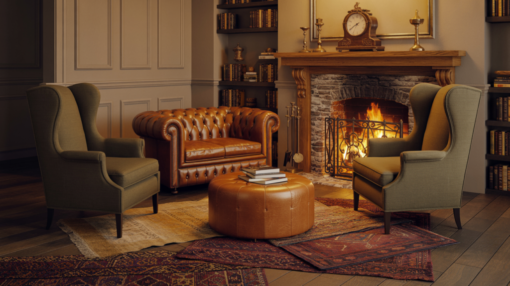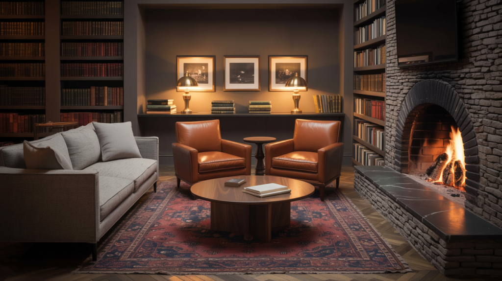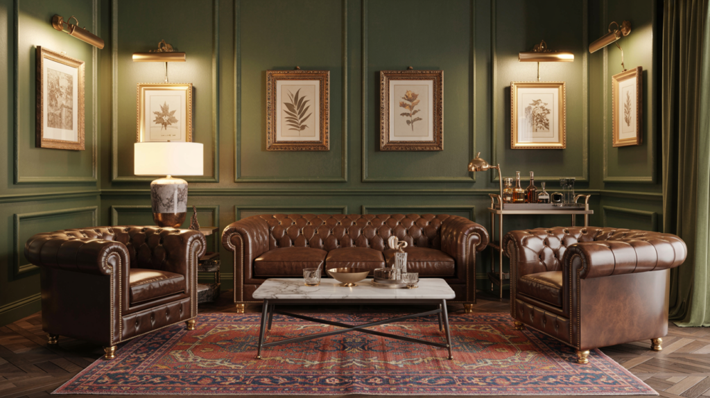 The Chesterfield club room layout channels the moody glamour of London gentlemen’s clubs and speakeasy-era lounges. Anchor the space with a deep-buttoned Chesterfield sofa in leather (traditional) or velvet (contemporary twist) and flank it with matching club chairs in complementary upholstery. The arrangement should feel slightly formal, slightly rebellious—think: straight lines softened by luxurious materials. A substantial coffee table in dark wood, marble, or blackened steel grounds the arrangement. This layout demands drama in the details: picture lighting above framed vintage maps or botanical prints, a bar cart in unlacquered brass and smoked glass, a Persian rug in deep crimson and navy. Styling Tip: Paint the walls in a moody mid-tone (charcoal, forest green, or deep burgundy) to create the enveloping, jewel-box atmosphere that makes this warm living room layout so intoxicating.