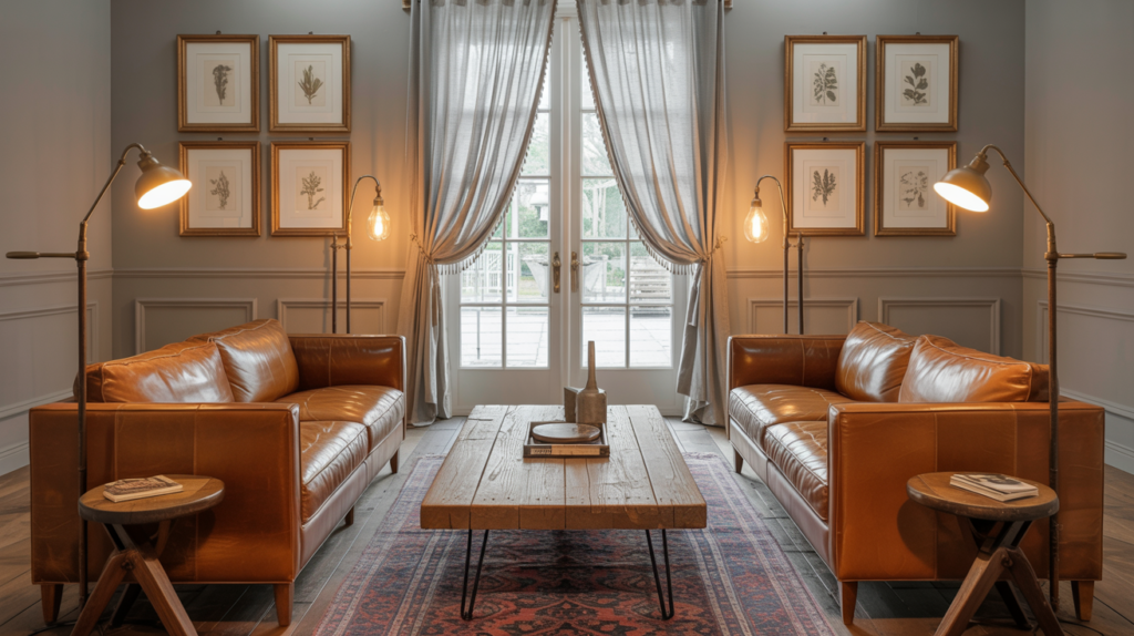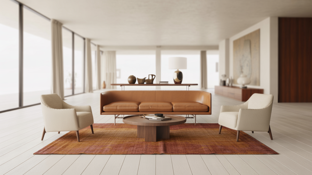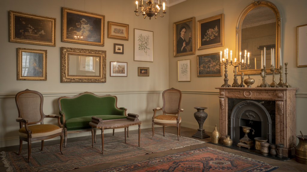 The vintage parlor arrangement rejects matchy-matchy modernism in favor of collected-over-time eclecticism. Source seating from different eras and styles—a Victorian settee reupholstered in velvet, a pair of Danish modern armchairs, a cane-back bergère—and arrange them in conversational groupings that feel organic rather than forced. The unifying thread is quality and patina: each piece should have substance, history, and a story. This warm living room layout works because it feels personal, like you’ve inherited pieces from interesting relatives and woven them into your own narrative. Layer in antique rugs (don’t worry if they’re worn—that’s character), vintage brass lighting, and collections displayed on open shelving or mantels. Styling Tip: Limit your color palette to three main tones (e.g., cream, forest green, terracotta) while allowing wood tones and metal finishes to vary wildly—this creates visual cohesion without sacrificing the collected aesthetic.
