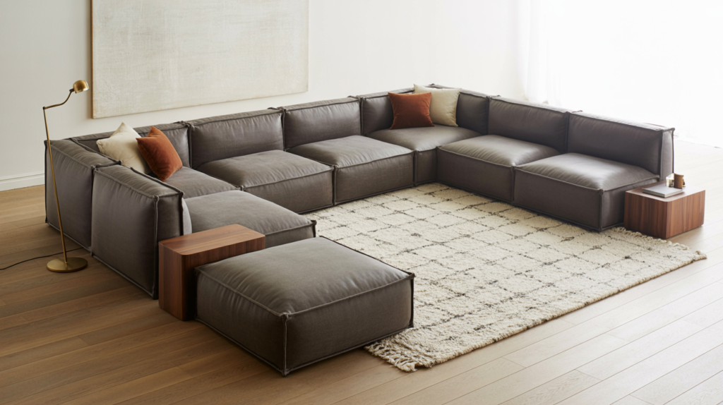 The modular sofa layout is the answer for those whose lives and hosting needs shift seasonally. Invest in a high-quality modular system with individual sections (armless chairs, corner pieces, ottomans) that can be rearranged for different occasions: a straight sofa for daily life, an L-shape for movie night, a U-shape for parties, separate seating clusters for intimate gatherings. The key is choosing upholstery that hides the modularity—performance fabrics in solid colors (charcoal, camel, sage) read as intentional design rather than furniture-store pragmatism. Anchor the arrangement with a large area rug that accommodates various configurations and layer in fixed elements (side tables, floor lamps, art) that remain constant as the seating shifts. Styling Tip: Invest in beautiful connectors or opt for systems with hidden hardware—visible clips and brackets kill the sophisticated vibe you’re after in this warm living room layout.