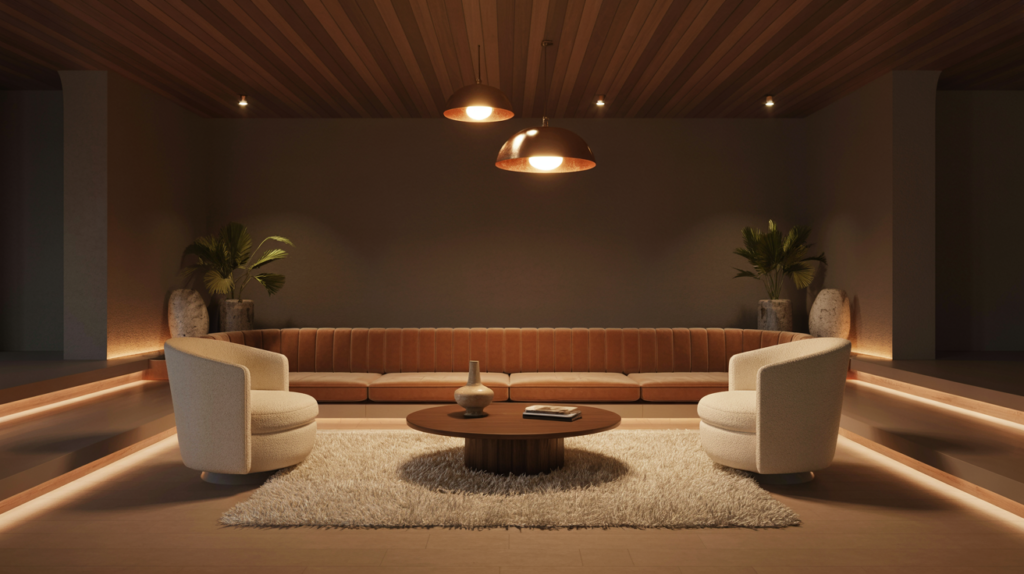 The sunken living room—that audacious architectural move from the ’70s—is experiencing a deserved renaissance. If you’re lucky enough to have one, treat it as the conversation pit it was designed to be. Arrange seating around all four sides of the sunken area: a long sofa along one wall, built-in banquettes or individual chairs along the others. The lowered floor creates automatic intimacy and drama; your job is to enhance it with luxurious upholstery (velvet, mohair, bouclé), plush pillows, and lighting that emphasizes the room’s unique geometry. The step-down becomes a psychological threshold—you’re not just entering a seating area, you’re descending into a dedicated space for connection. Styling Tip: Install cove lighting around the perimeter of the sunken area, hidden beneath the upper floor’s edge, to create a glowing halo effect that emphasizes the architectural drama after dark.