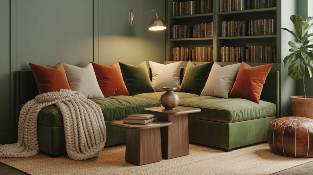 The sectional corner layout transforms awkward architecture into asset, particularly in smaller living rooms where space is precious. Choose a deep-seated sectional in performance linen or velvet (think: moss green, charcoal, or warm taupe) and nestle it into the room’s natural corner, creating an L-shaped embrace. The magic happens in the layering: seven to nine pillows in varying scales and textures (lumbar, Euro, decorative), a chunky knit throw draped just-so, and a nesting side table for perpetual coffee cups. Extend the seating zone with a low-slung leather pouf that doubles as footrest and extra seating. This warm living room layout feels like a hug because it quite literally surrounds you. Styling Tip: Install a swing-arm sconce above one end of the sectional to carve out a dedicated reading nook without sacrificing floor space to a standing lamp.