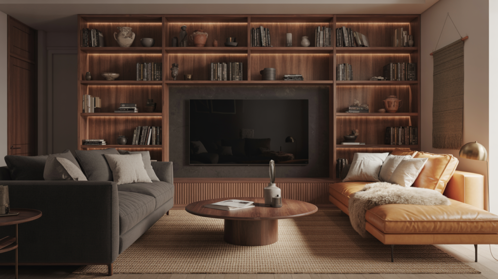 The L-shaped media layout reconciles modern screen-watching habits with the need for warmth and texture. Position a generous sofa facing your media console, then extend the seating zone with a perpendicular loveseat or chaise that creates an L-configuration. This allows flexible viewing angles while maintaining conversational capacity. The trick to keeping this warm living room layout from feeling like a showroom is aggressive layering: pile on the pillows, drape a vintage suzani over the sofa arm, introduce a velvet ottoman for feet-up lounging. Ground the arrangement with a wool area rug large enough to tuck under all front legs. Frame the television with floor-to-ceiling built-ins in a warm wood tone or painted in deep charcoal—this architectural move transforms the screen into intentional design rather than awkward afterthought. Styling Tip: Use dimmable LED strips behind the media console to create ambient backlighting that reduces eye strain and adds atmosphere.