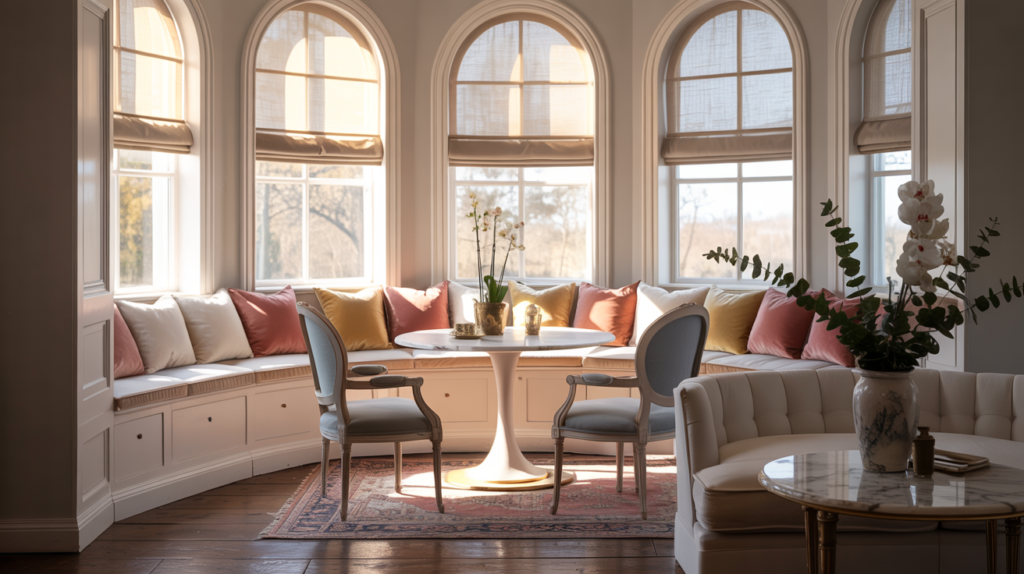 If you’re fortunate enough to have a bay window, treat it as the jewel it is by building your living room layout around it. Position a tight-back sofa perpendicular to the windowed alcove, then fill the bay itself with a built-in cushioned bench or a pair of petite armchairs facing inward. This creates a secondary sitting area bathed in natural light—perfect for morning coffee or afternoon reading. The bay becomes a room within a room, a threshold space that connects interior comfort with exterior views. Layer the window seat with linen cushions and velvet pillows in sun-faded hues (dusty rose, pale gold, weathered blue) that complement rather than compete with the changing daylight. Styling Tip: Install Roman shades in a natural fabric like Belgian linen to diffuse harsh midday sun while maintaining the warmth and texture that makes this warm living room layout so inviting.