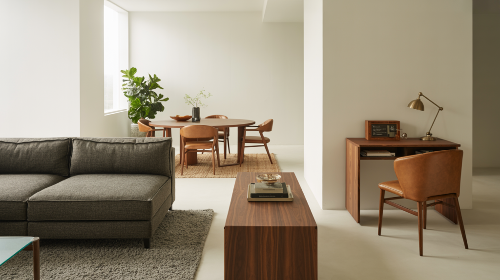 The multi-zone layout addresses the modern challenge of open-concept living: how do you create distinct areas for lounging, dining, and working without walls? The answer lies in strategic furniture placement and visual anchors. Establish your primary seating zone with a sofa and chairs arranged around a coffee table, then use a console table or low bookshelf as a subtle divider between the living and dining areas. A large area rug under the living furniture and a separate rug under the dining table reinforce the zoning. If you’re incorporating a work area, tuck a writing desk against a wall with a beautiful chair that complements (but doesn’t match) your living seating. The coherence comes from repeating materials and tones: if your sofa is charcoal linen, echo it in your dining chairs; if you’ve used brass in your living room lighting, carry it into your desk lamp. Styling Tip: Use varied lighting temperatures across zones—warmer (2700K) for living and dining, slightly cooler (3000K) for work areas—to subtly reinforce functional boundaries.