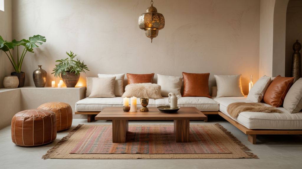 The low-profile floor seating sanctuary borrows from Japanese, Moroccan, and Scandinavian traditions—cultures that understand the psychological comfort of being close to the ground. Replace conventional sofas with a low-slung platform sofa (no legs, or legs under 6 inches), oversized floor cushions, and poufs arranged around a coffee table that barely clears ankle height. This warm living room layout creates intimacy through its very architecture; everyone sits at eye level, encouraging relaxed conversation. Layer texture aggressively: sheepskin over the platform sofa, vintage kilim pillows, hand-woven jute rug, linen drapes that puddle on the floor. The room should feel collected rather than curated, with textiles from different traditions conversing rather than matching. Styling Tip: Hang pendant lighting low (60–66 inches from floor) to bring the light source down to your lowered sightline, creating cocoon-like atmosphere in the evening.